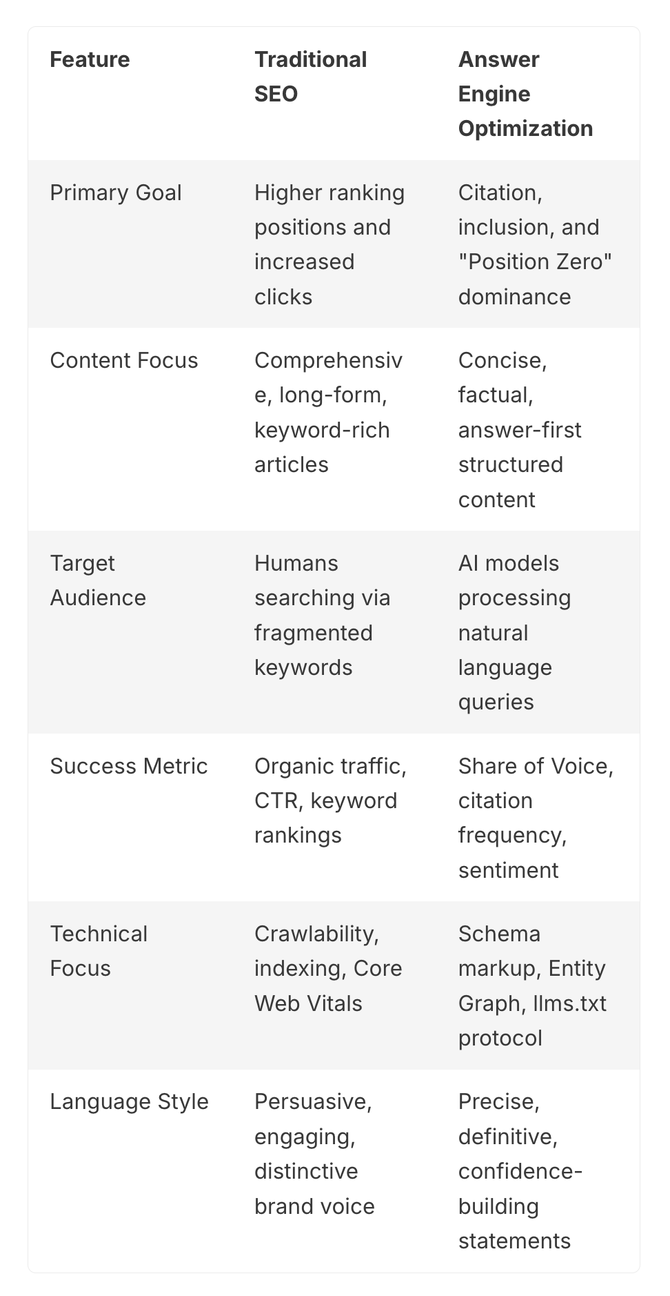 The technical architecture of these two strategies differs significantly. SEO relies heavily on signals like domain authority, backlink profiles, and keyword density to signal relevance to a crawler. In contrast, AEO prioritizes structured data (Schema markup) and high "truthfulness" scores. Because AI models prioritize synthesis over citation, AEO requires content to be formatted in a way that machines can easily parse, categorize, and repeat as a factual statement.